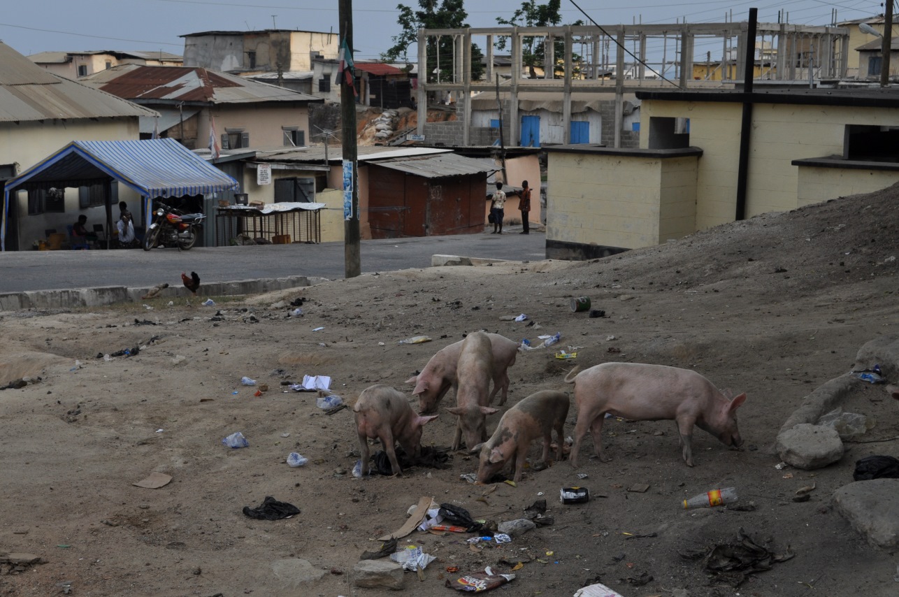 Pigs grazing on trash (fairly close to the center of town)...