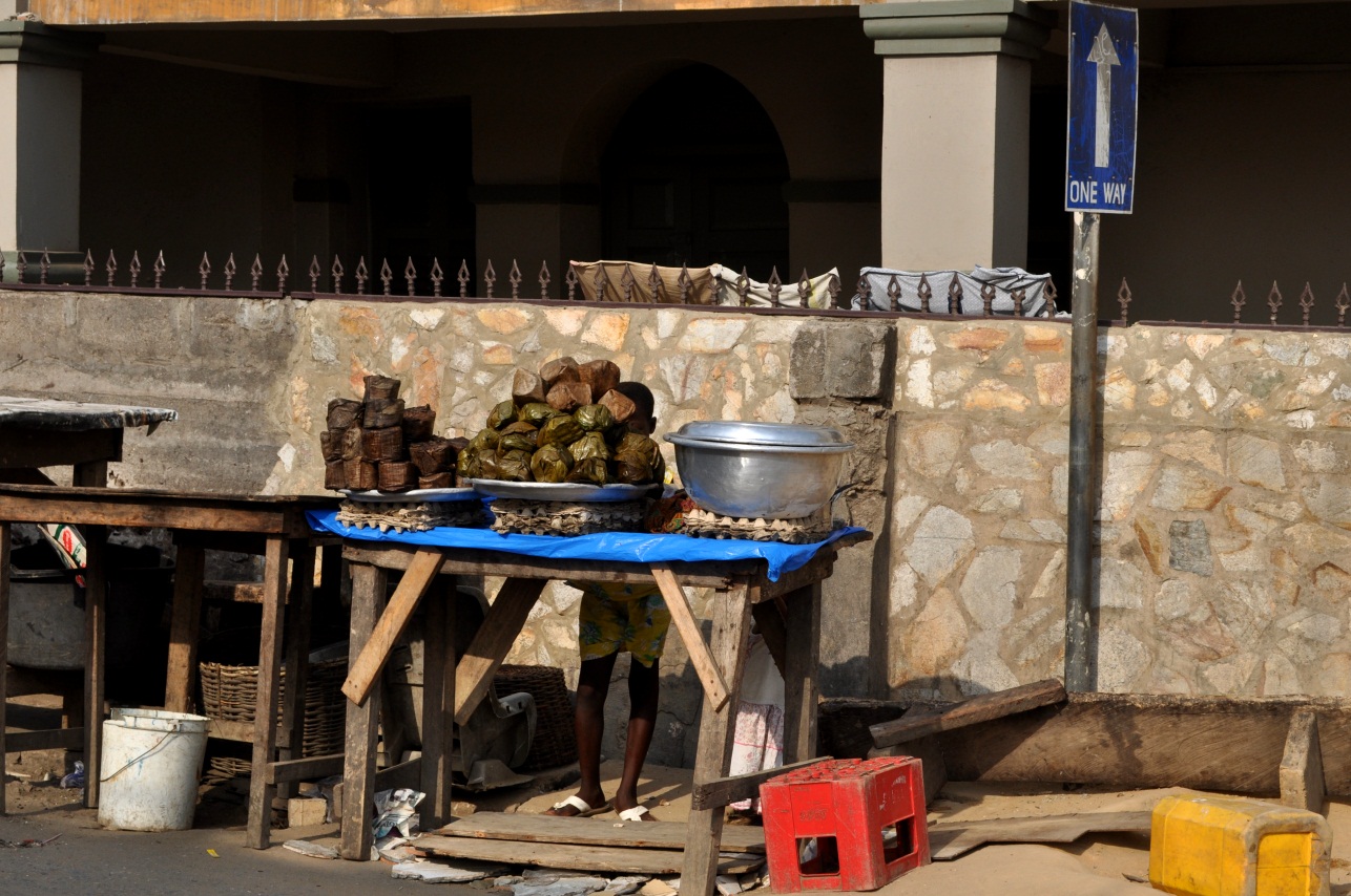 In Elmina, someone was selling kenkeys, which are dumplings wrapped in leaves...