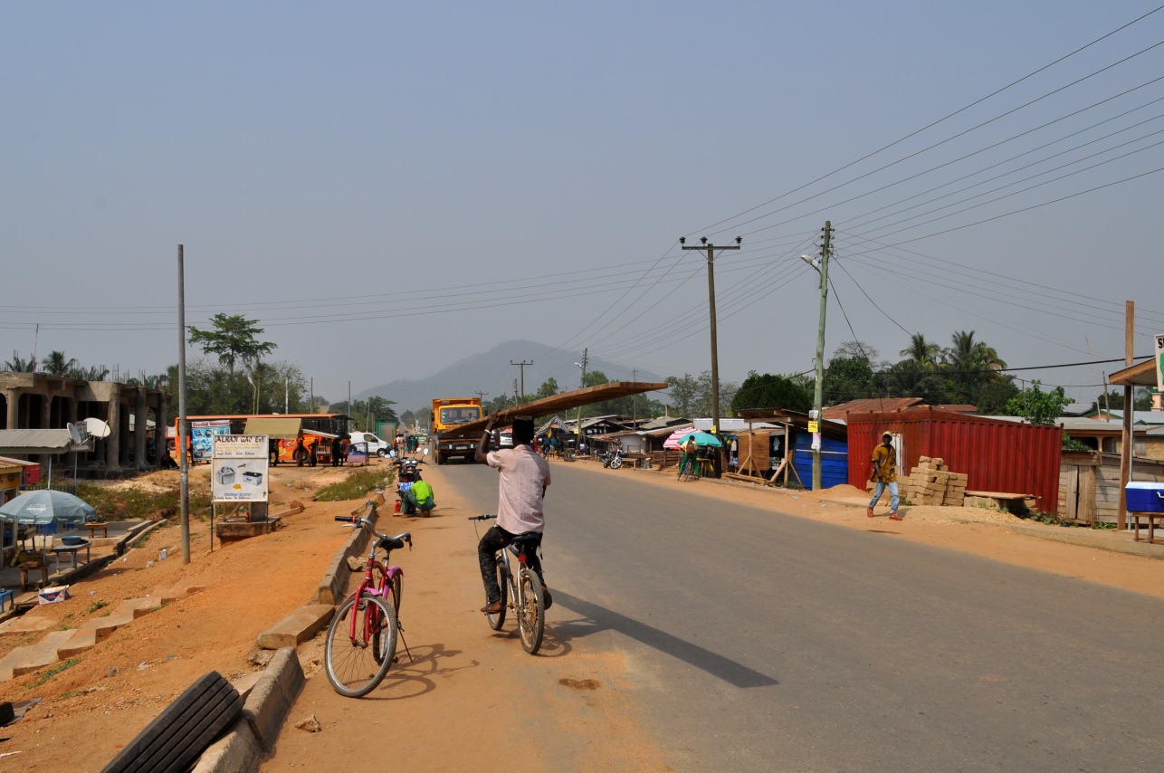 One of the streets in Hohoe with a bicyclist carrying wood on his head while riding...
