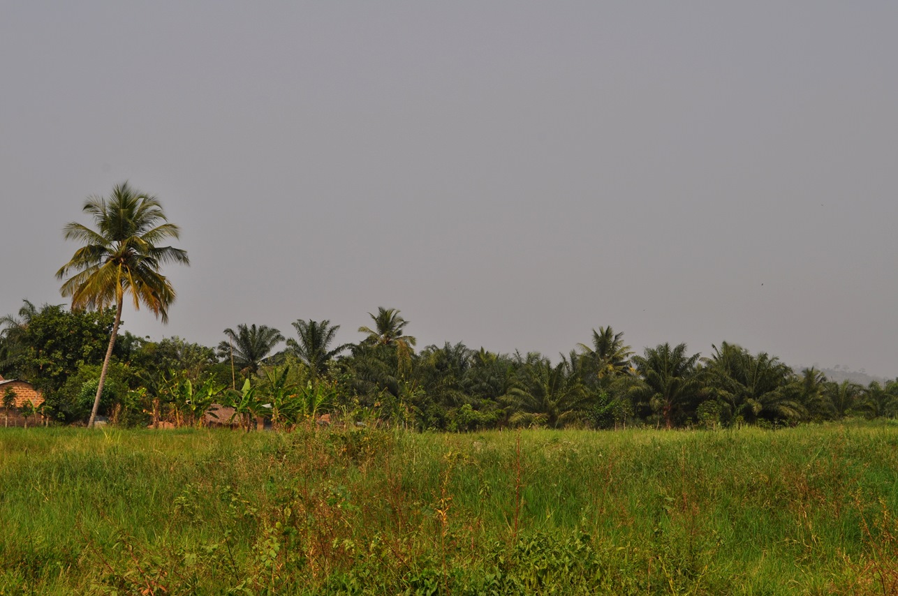 At the very edge of town...an oil palm farm (with the also ubiquitous coconut palm to the left)...