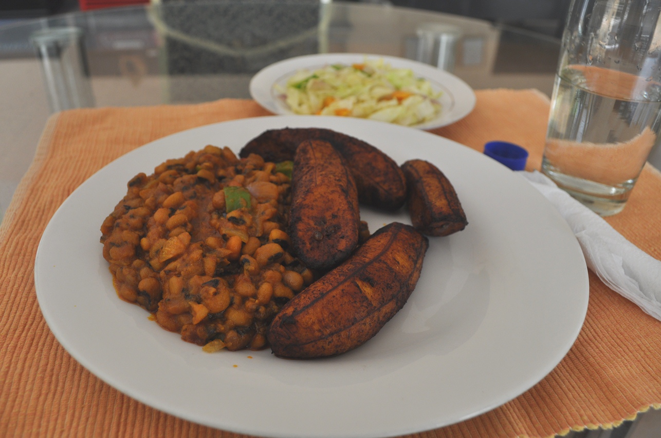 A common dish in Ghana, red red, which is plantains with beans or black-eyed peas (eaten at a place in Wli)...