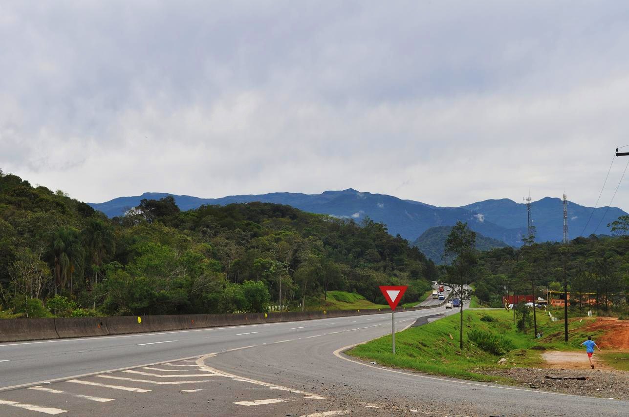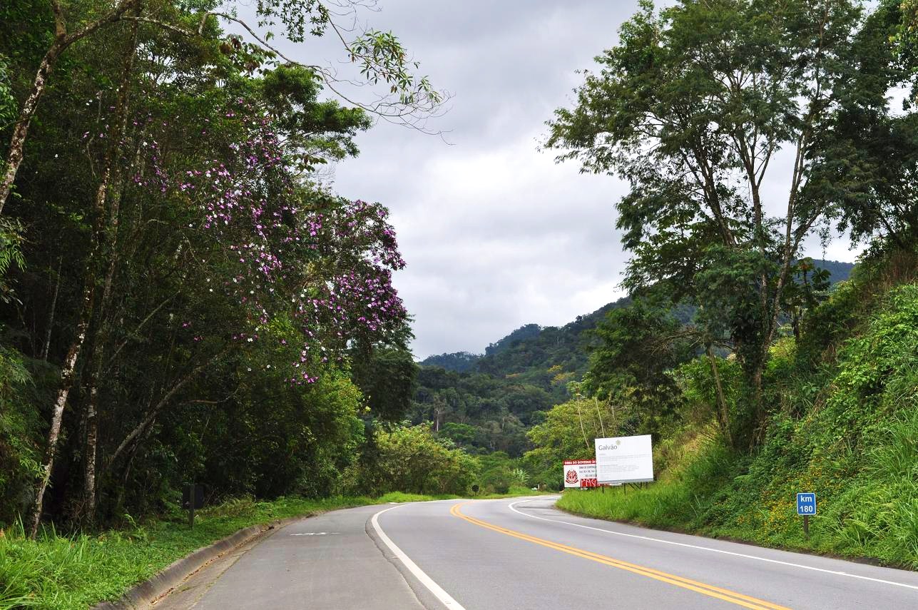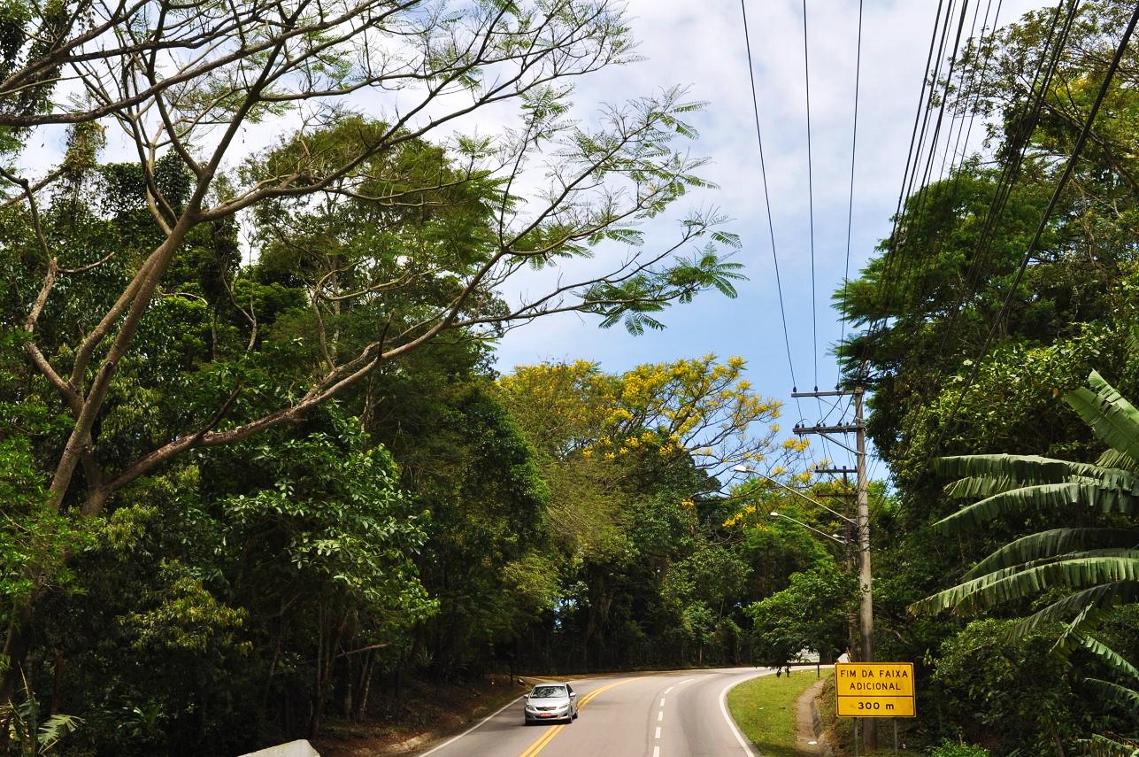 Brazil Highway 101 where it juts inland a bit from the coast near Rio Una (east of Santos). Note that there are some Tibouchina mutabilis in bloom here.