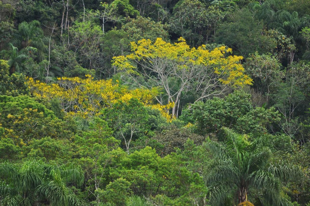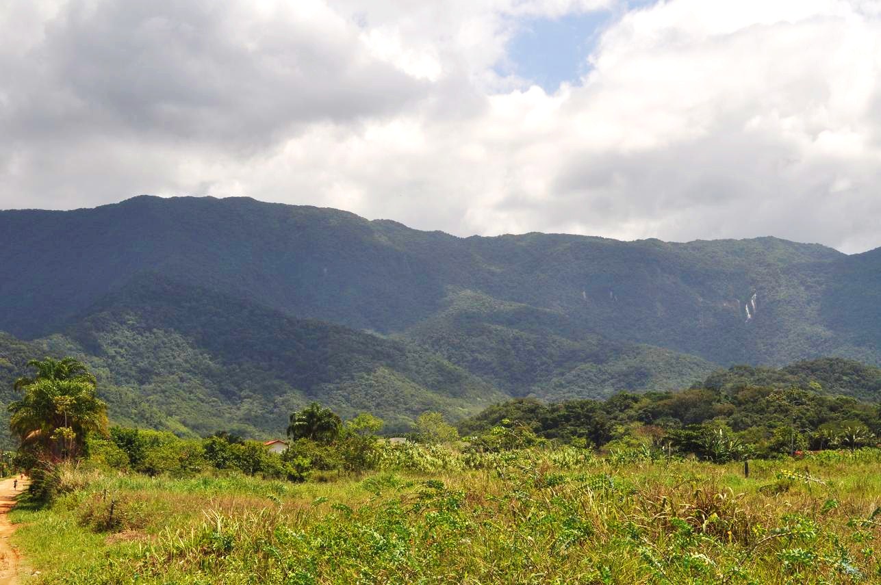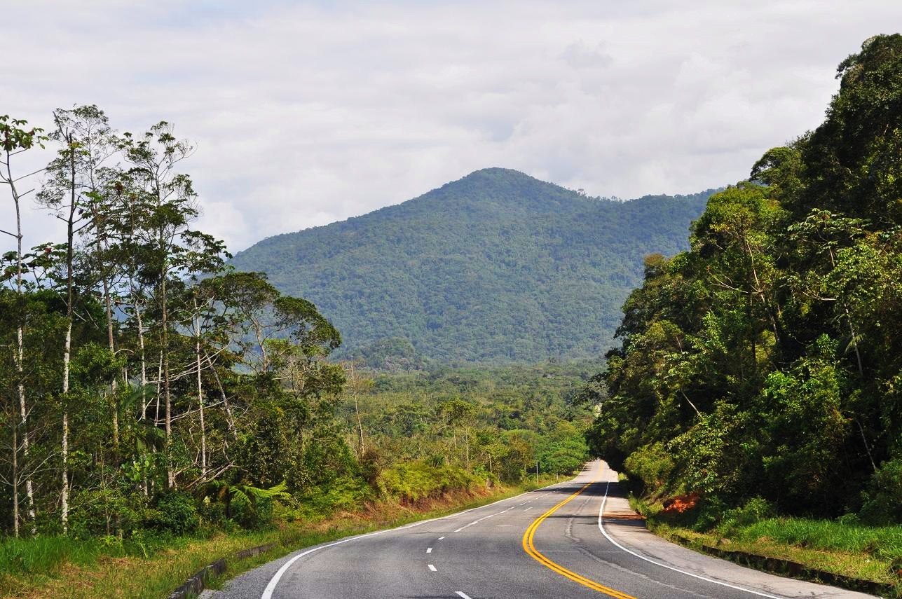 Brazil Highway 101 where it juts inland a bit from the coast near Rio Una (east of Santos). Note that there are some Tibouchina mutabilis in bloom here.