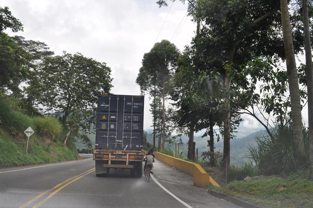 First, a couple bike riders getting a free ride hanging onto a slow-moving truck (not very far up the mountain yet--around 6000' probably)!