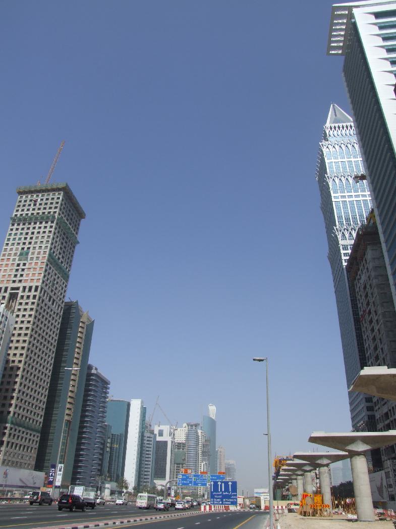 Sheikh Zayed Road, where dense skyscrapers extend almost to the sides of the freeway...