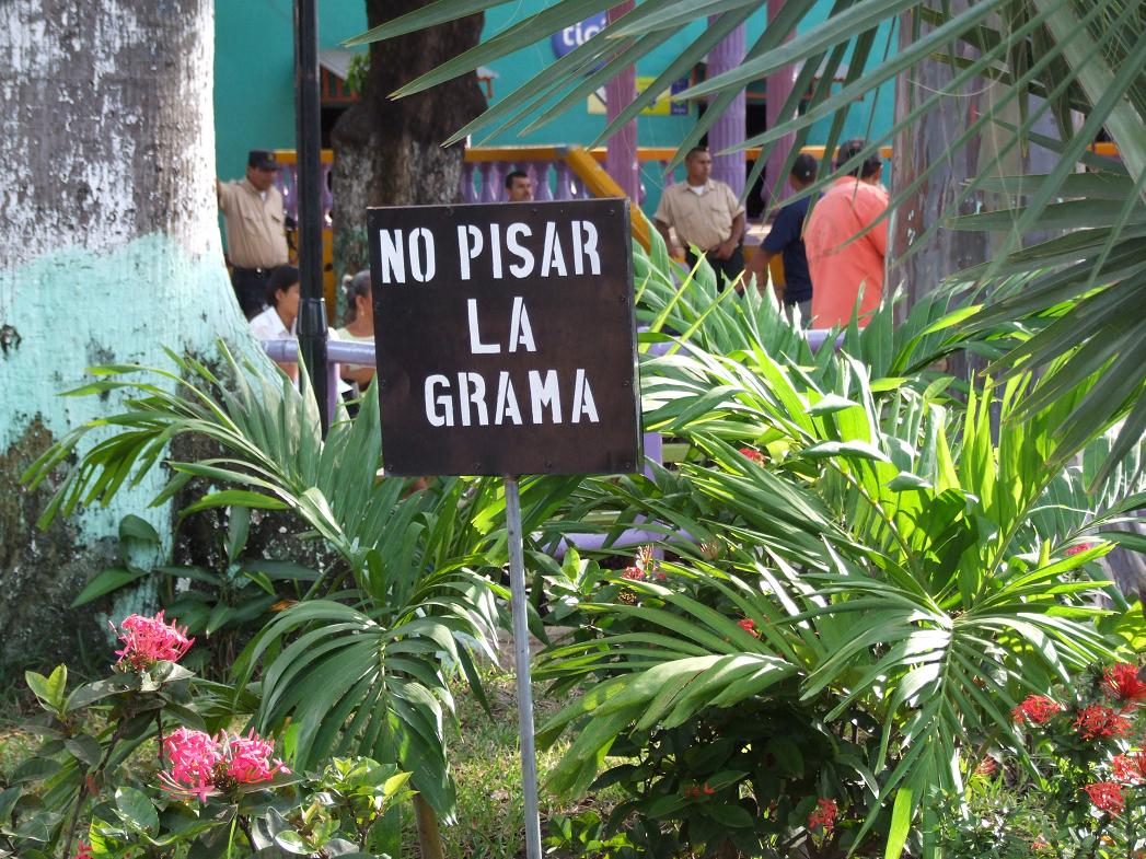 An entertaining sign (Looks like "No pissing on the grass", though I know now that it's "No stepping on the grass")...
