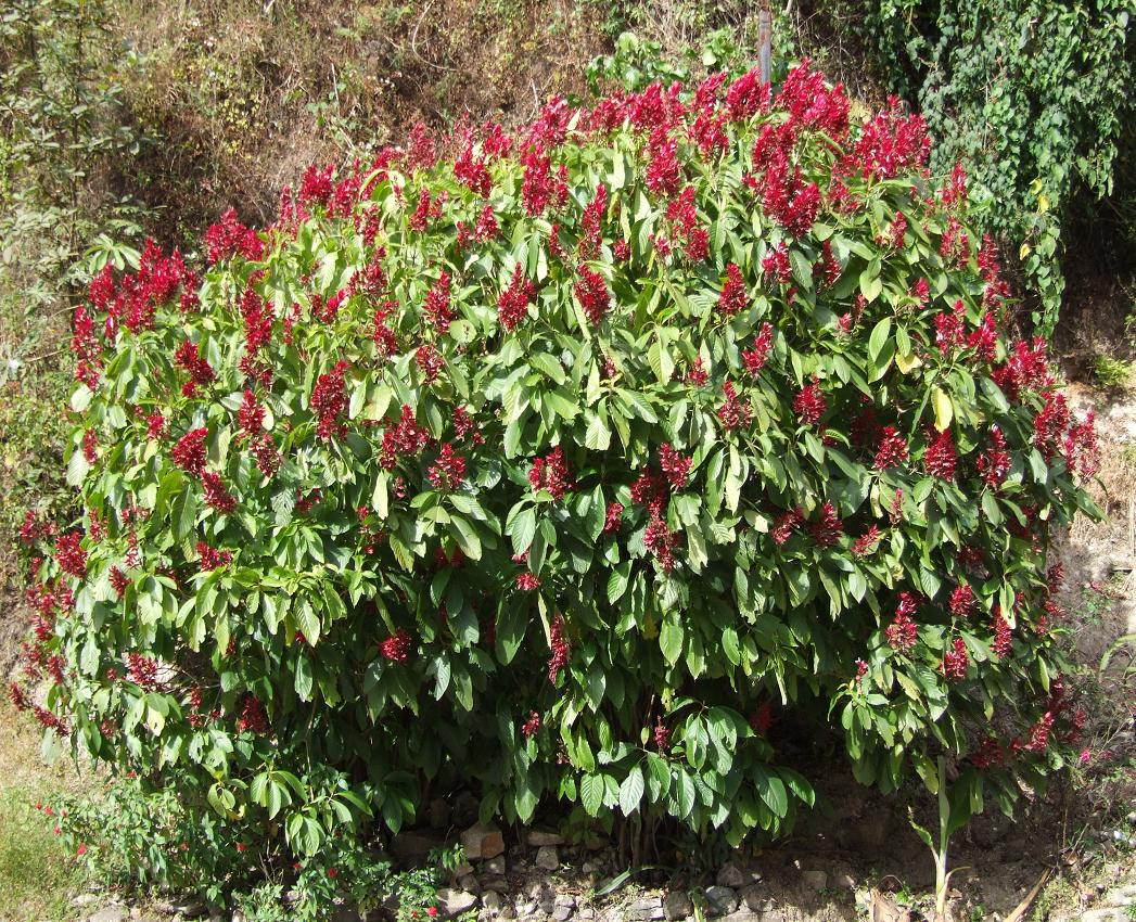 A Brazilian red cloak shrub (Megaskepasma erythrochlamys) in full-bloom along the side of Central America Highway 4...