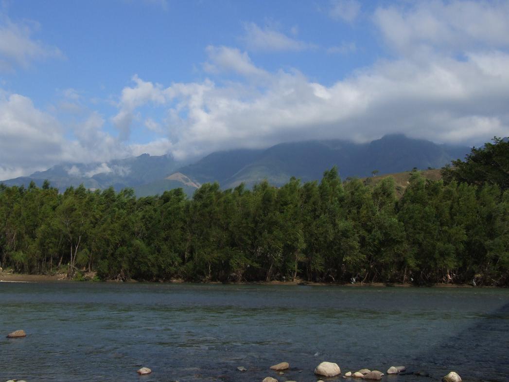 Lempa River near the Honduras border (with native willows, which look similar to those in temperate North America, and El Pital in the background)...