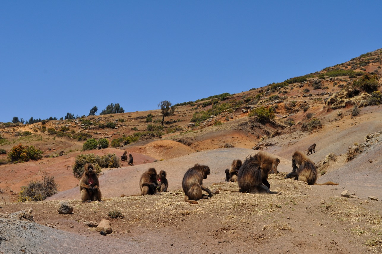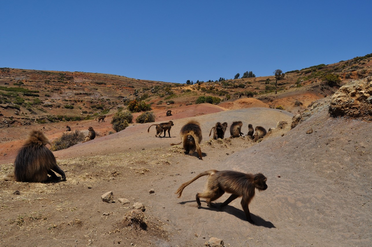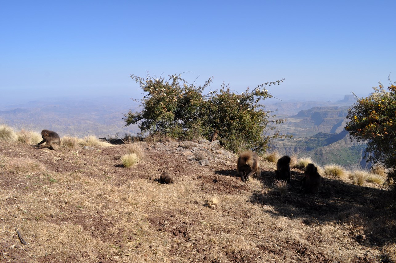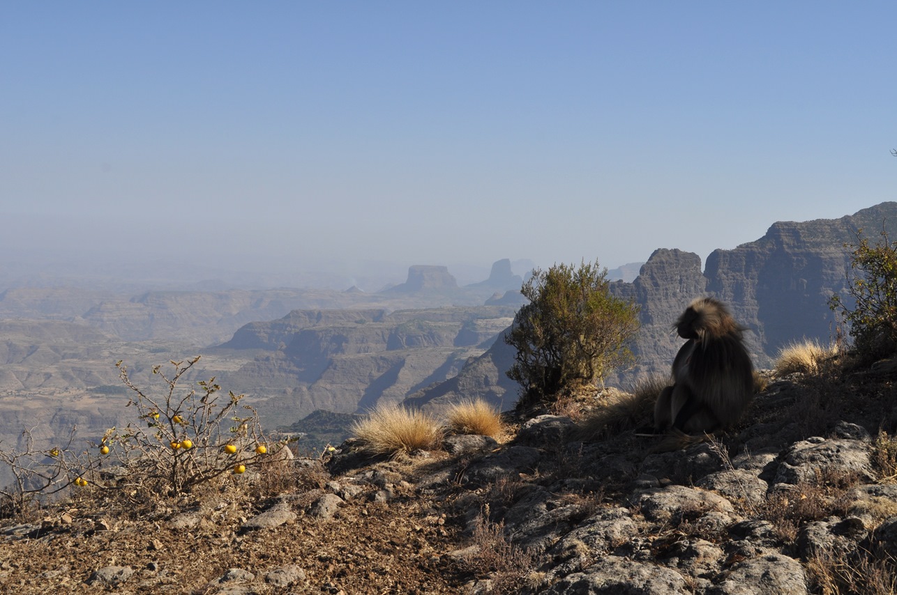 Another escarpment view to the north, this time with the endemic monkey, the gelada (Theropithecus gelada), and a soda apple (Solanum aculeastrum) with its (inedible) yellow fruits to the left...
