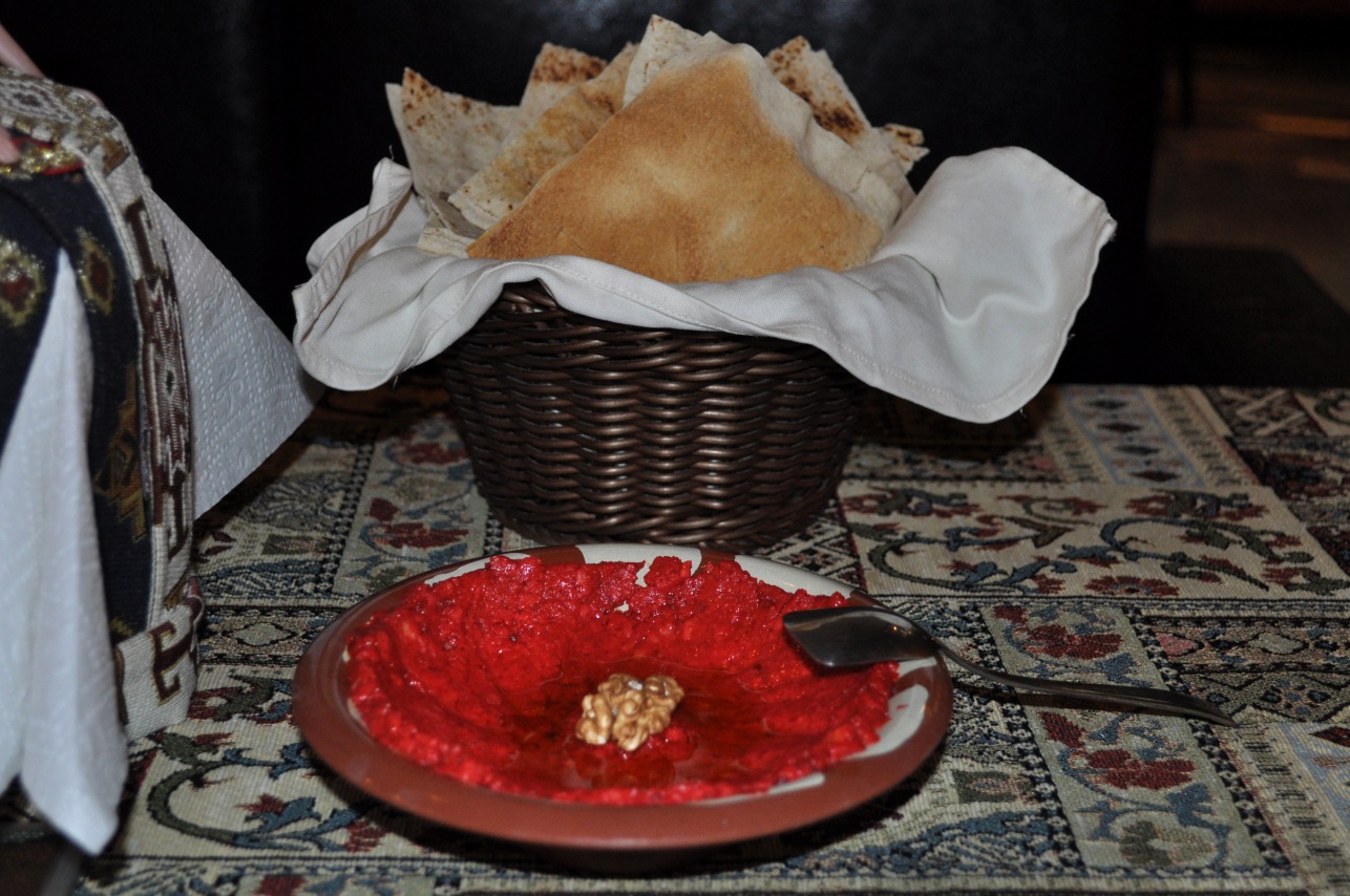 From Armenia, here's a pomegranate/walnut spread with pita bread (more of a Middle Eastern dish--but due to the Armenian diaspora further south in Lebanon and Syria a lot of Middle Eastern food is popular in Armenia)...