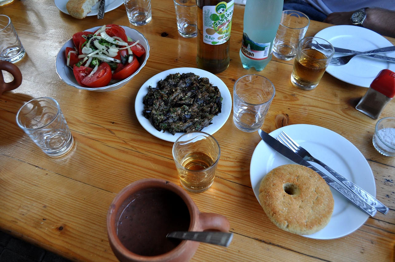 First of all, a Georgian meal with lobio (bean soup), mchadi (corn bread), an eggplant dish and a salad with very sweet tomatoes and onions...