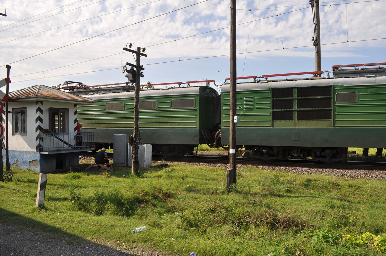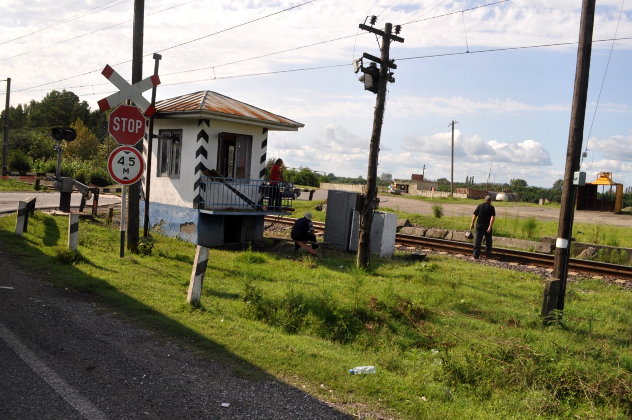 A Georgian railroad crossing (in western Georgia). It's notable that each major railroad crossing is manned (and the gates come down much earlier than in the US when a train comes--a couple minutes before!)...