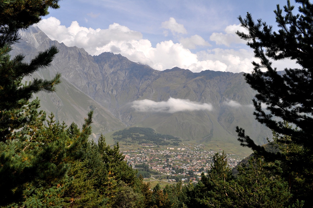 Kazbegi (officially known as Stepantsminda) is a town in the Caucasus Mountains of far northern Georgia, about 6 miles from the border with Russia. There are very large mountains surrounding Kazbegi, including Mount Kazbek at around 16,500 feet above sea level (about 11,000 feet above the town, but only about 8 miles away to the west (with 13,000 foot mountains, or about 7,500 feet above the town, only about 6 miles to the east). There were surprisingly few trees in these mountains, even at elevations warm enough for tree growth (and the area appears to receive sufficient rainfall).
