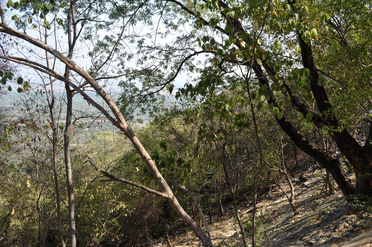 Looking northwest towards another pagoda and the partially deciduous woodlands (during the dry season)...