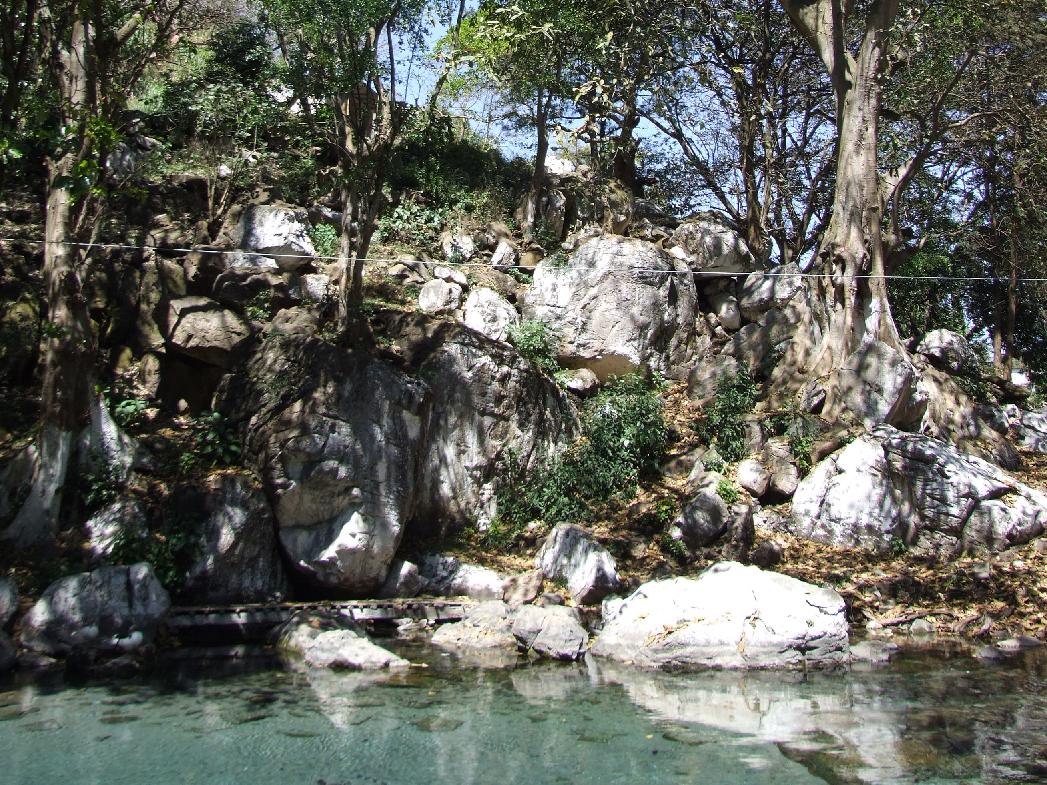 Another view of the pond, with boulders and a large fig tree to the right (Ficus)...