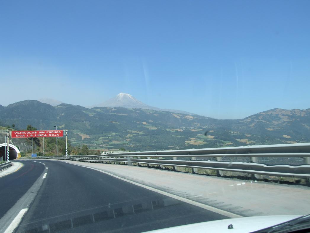 View of Pico de Orizaba from the long steep grade that goes from 8000' to 4000' in about 15 miles (this is from around 7000'). The red line for vehicles with brake failure is barely visible in the left lane (there's an emergency ramp a short distance below).