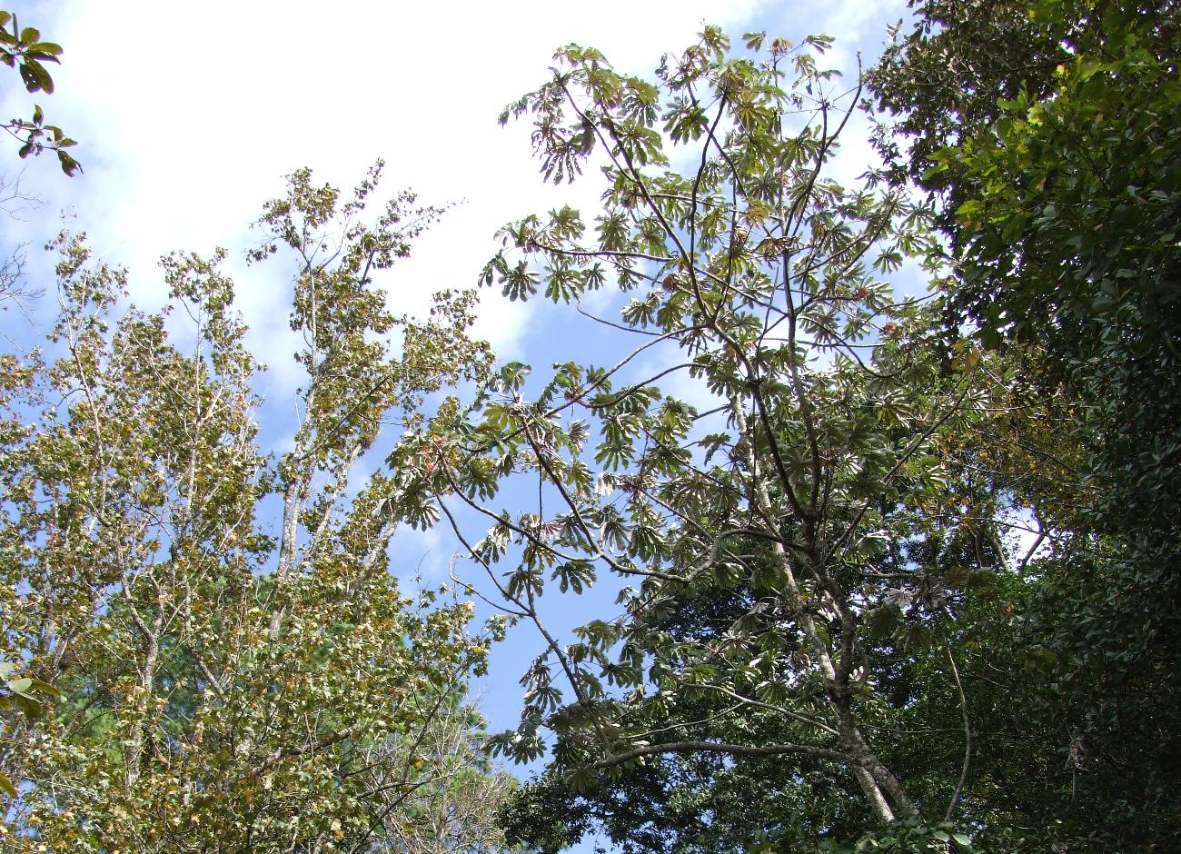 View of a sweetgum on left and cecropia on right...