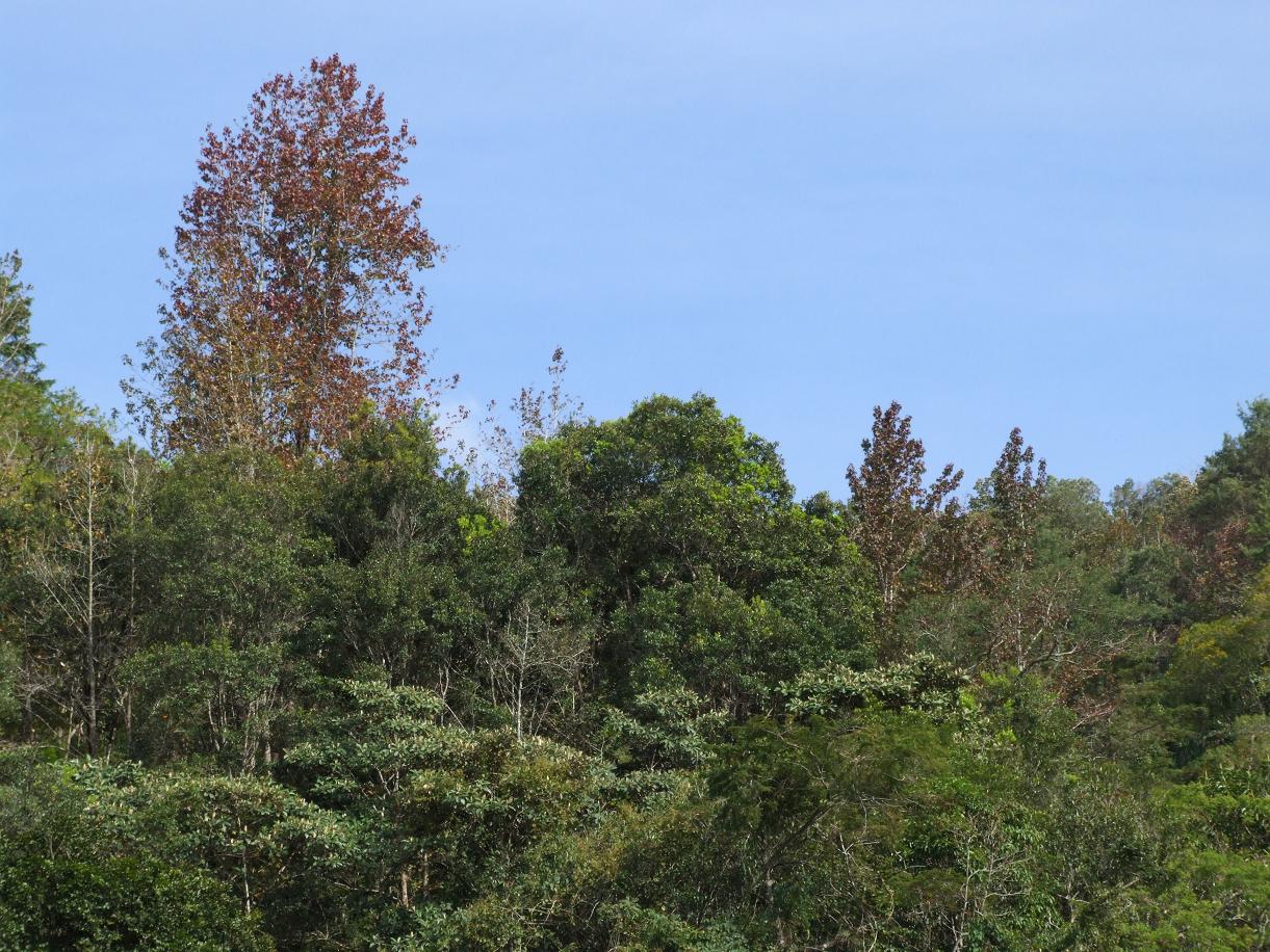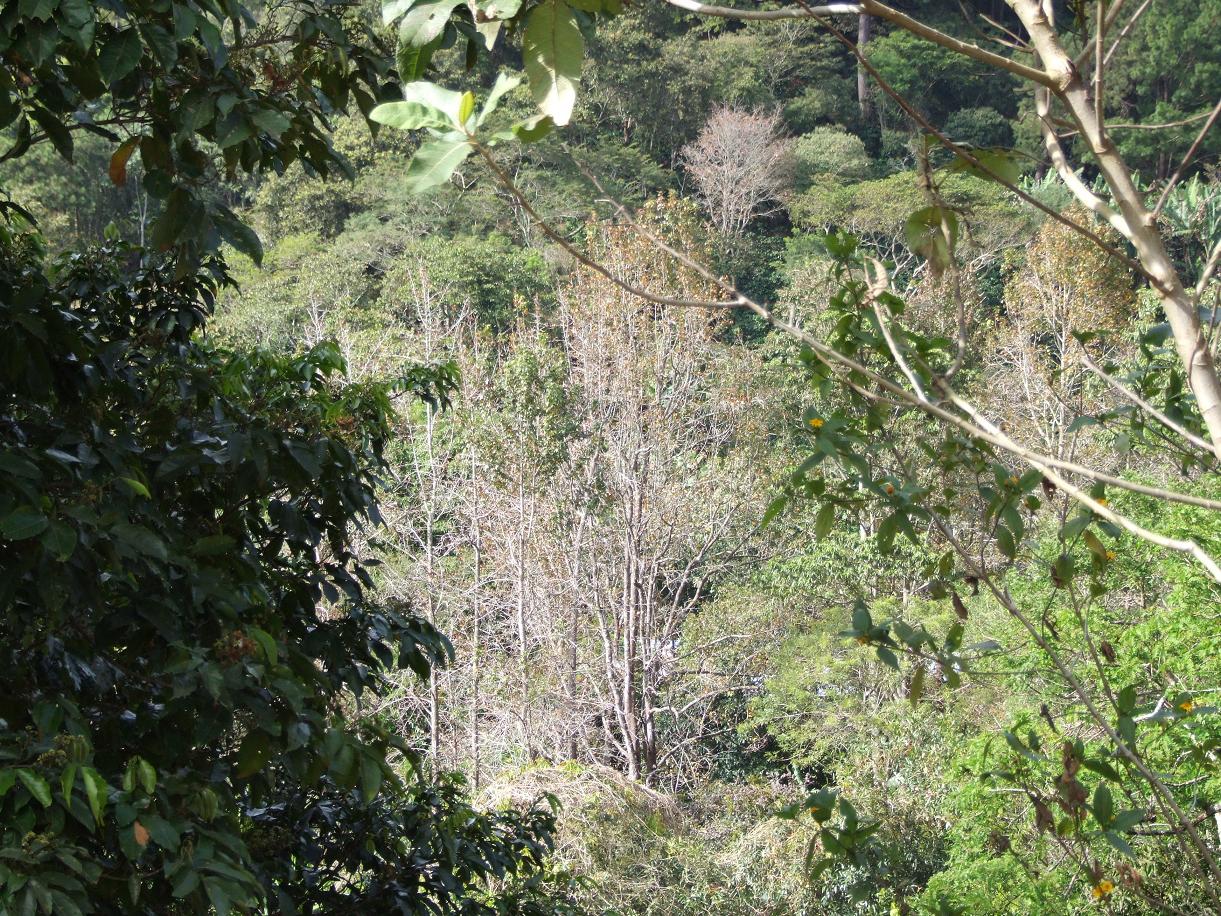 These pictures were taken on November 10, 2007, shortly after the end of the rainy season in El Salvador. That combined with the lower sun angle resulted in a moderate amount of autumn color (though less than sweetgums in the United States, native or cultivated). All of these sweetgums appeared to be wild; I saw no cultivated (or apparently cultivated) sweetgums in this area. Most of the sweetgums were on north-facing slopes.