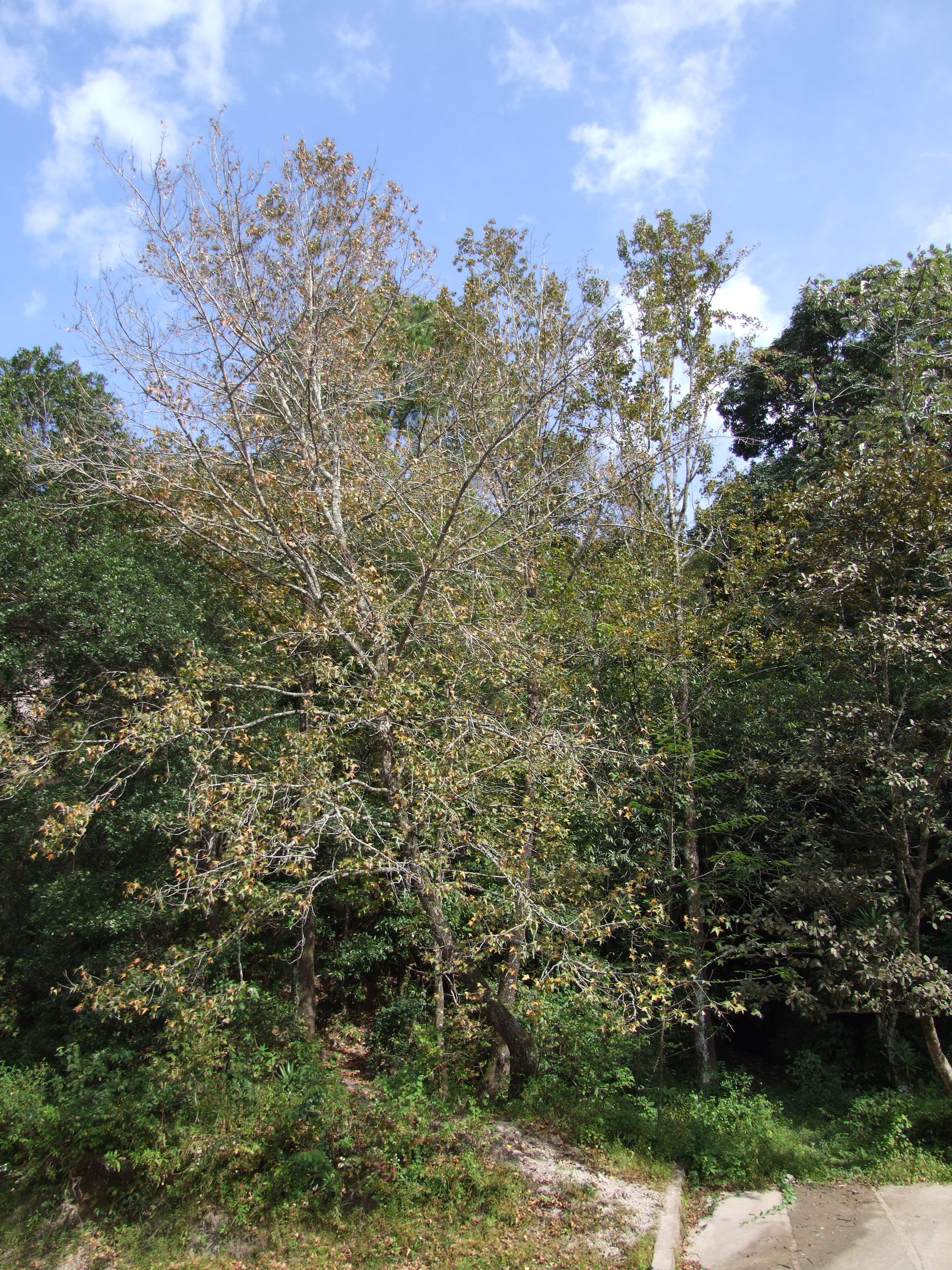The American sweetgum (Liquidambar styraciflua) has a wide native range, all the way from Connecticut to Nicaragua. The distribution from Mexico to Nicaragua is separate from the U.S. part and is only at higher elevations. This includes parts of El Salvador. I found sweetgums in the mountains at around 4000 feet above sea level just south of the town of La Palma (along Central American Highway 4, or CA-4), in the northern part of the country.