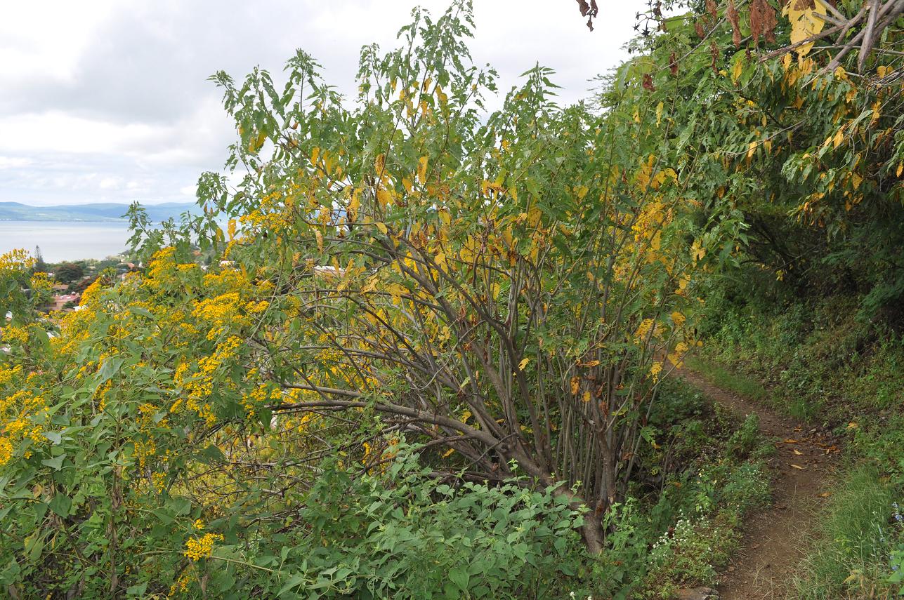 Back on the trail above Ajijic...some of the shrubs were already showing some yellow leaves (even though the rainy season hadn't ended yet), including this unidentified shrub (note the shrubs with the yellow blooms to the left)...