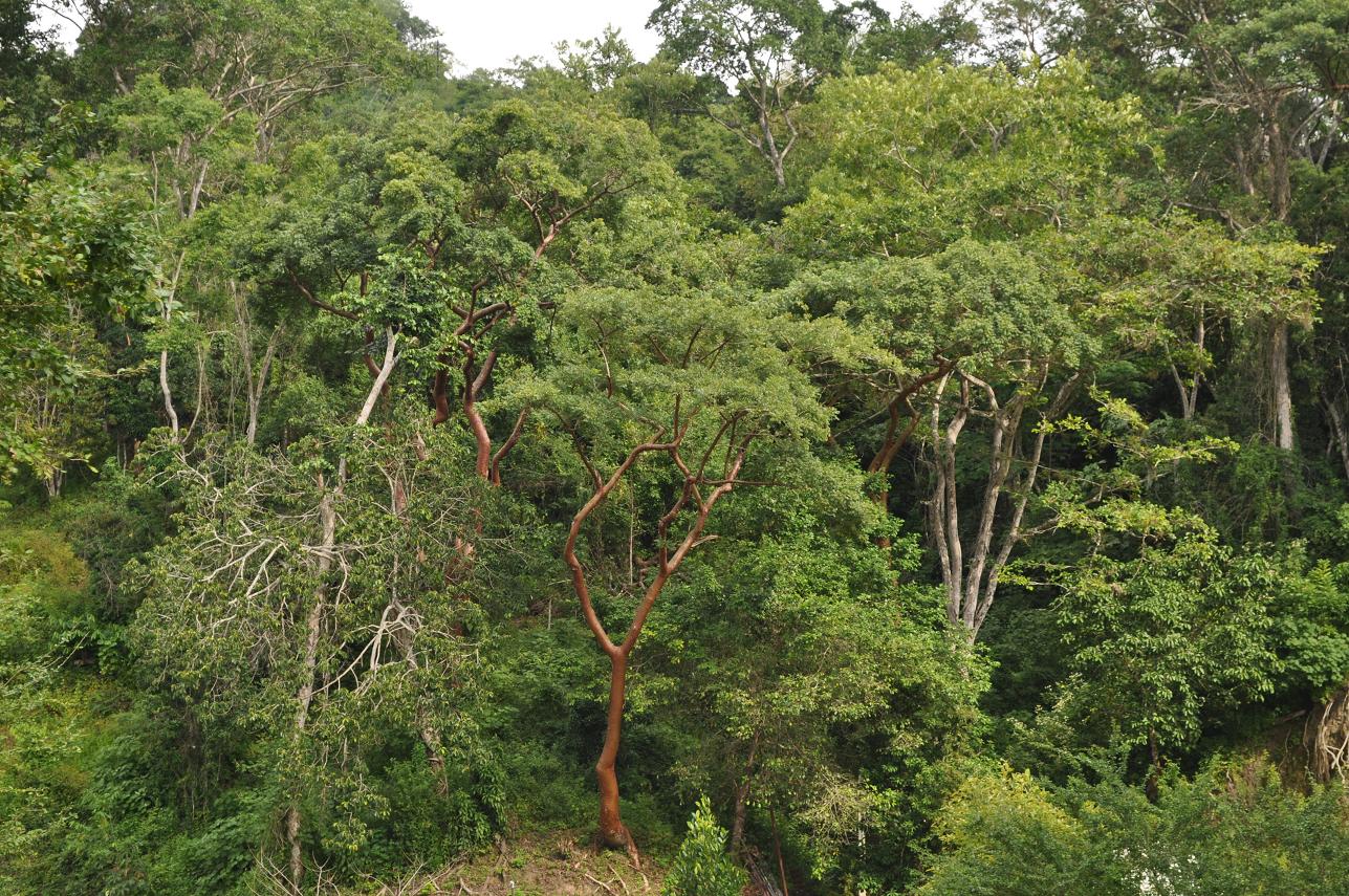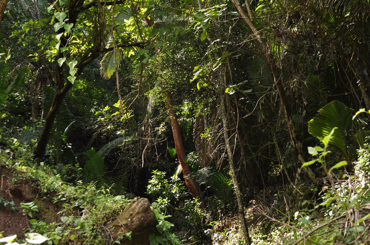 Looking the other direction (in forest). Note the Bursera trunk (and more Philodendron hederaceum)...